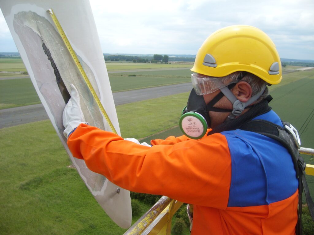 Les réparations plus importantes sont effectuées à l’aide de plates-formes suspendues par câble, spécialement conçues pour accéder à la pale ou à la tour.